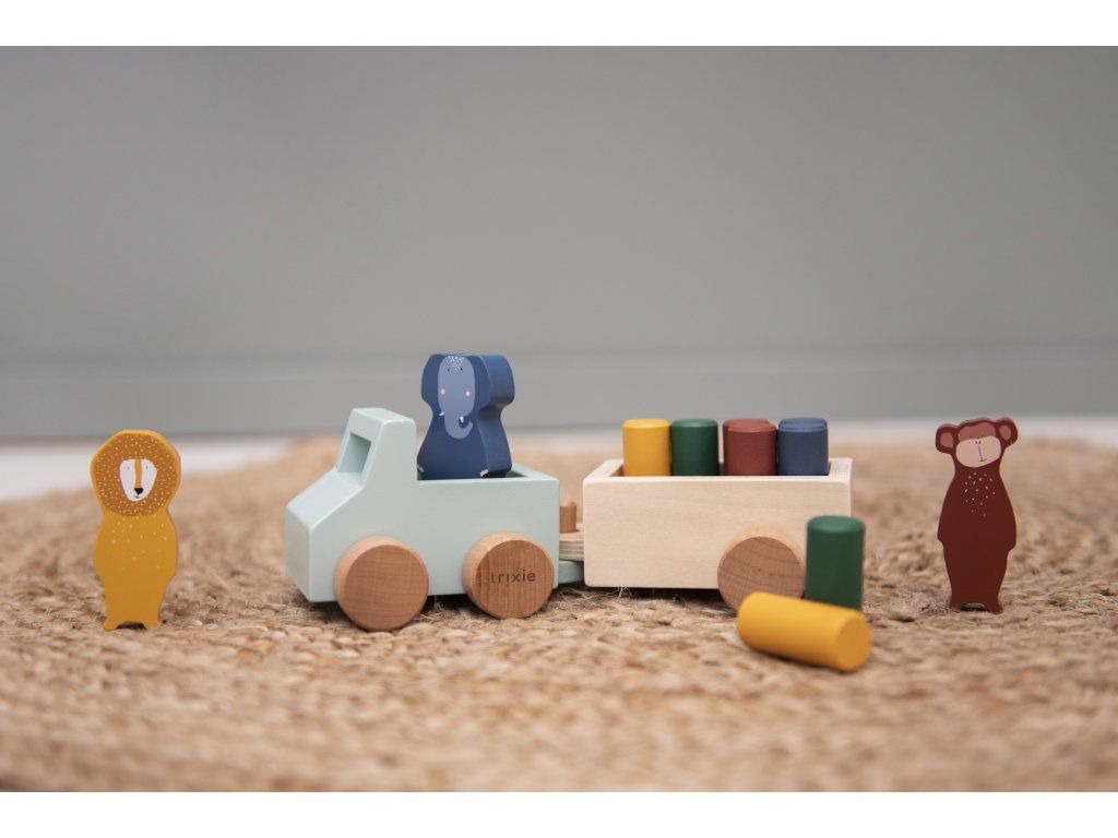 Dřevěné autíčko s přívěsem je ideální zábava pro milovníky těžké práce. 3 dřevěná zvířátka jako závozníci a spoustu nákladu, který je potřeba odvést na stavbu. Zábavná hračka, která podporuje vývoj jemné motoriky, představivosti, a správné koordinace oko - ruka.
