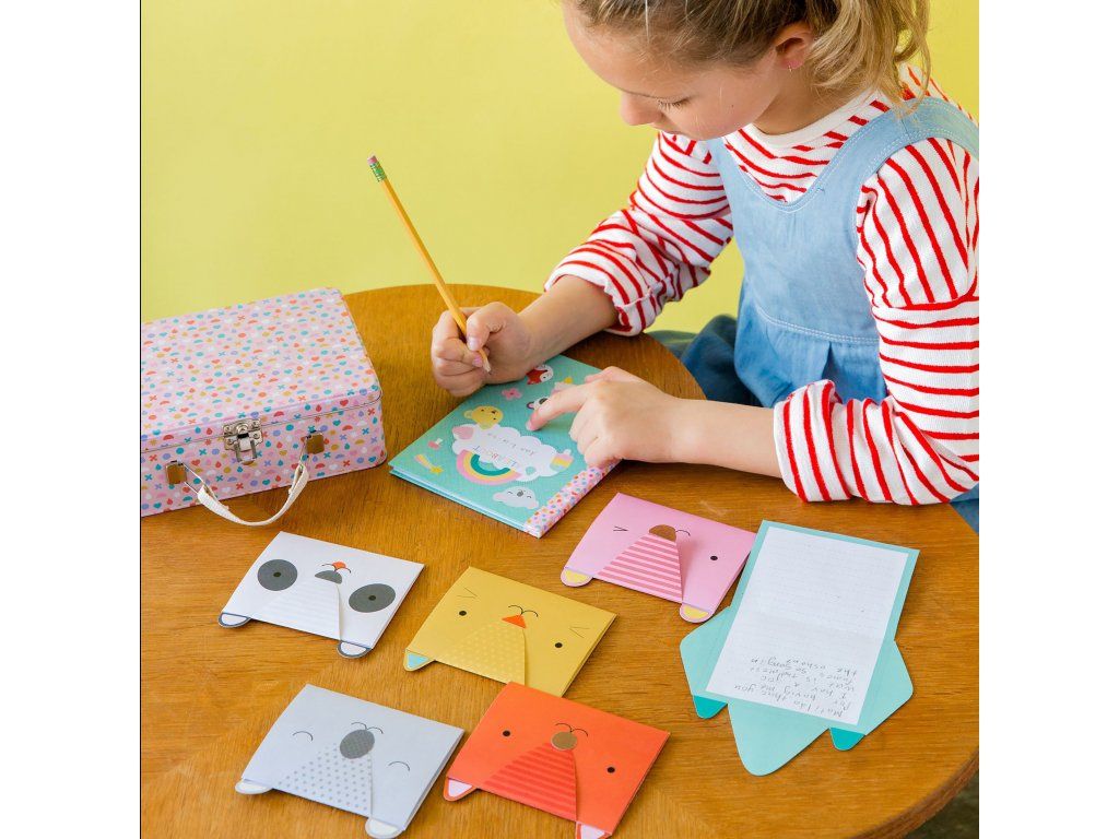 Sada obsahuje 12 zvířecích psaníček, 1 deník, 2 listy nálepek, 4 barevné tužky a jednoduchý ilustrovaný návod.