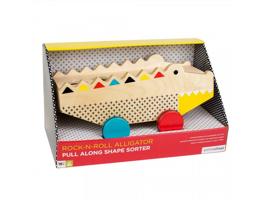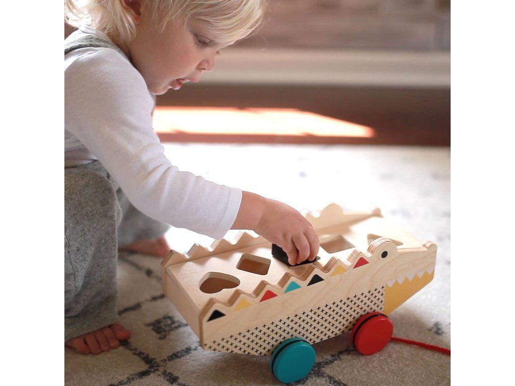 Aligátor, který je tahací hračkou a vkládačkou v jednom. Pět kostek různých tvarů lze jednoduše vložit do otvorů v aligátorovi. Hračka má pogumovaná, kvalitní kolečka, které zajistí hladký pohyb po domácích podlahách. Hračka je vyrobena z odolného dřeva a tak Vám jistě vydrží po mnoho let. Rozvíjí koordinaci ruka - oko, poznávání barev a tvarů. Šňůrka na tahání nabádá batolata k chůzi.