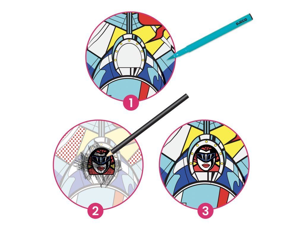 Balení obsahuje: 4 ilustrované karty (20 cm x 20 cm), 4 fixy (modrá, červená, žlutá, nebesky modrá), 4 listy obtisků, 1 brožurka s barevným vysvětlením krok za krokem.