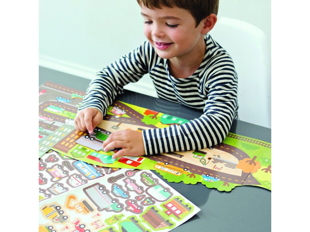 Na oboustranné ilustrace mohou malí tvořivci nalepit až 100 ks papírových nálepek, které se navíc dají odlepovat a nalepovat pořád dokola. Nekonečná zábava pro holky i kluky. Každý si vytvoří svoje město tak, jak ho právě cítí. Ideální zábava na doma i na cesty! Podporuje jemnou motoriku a kreativitu.