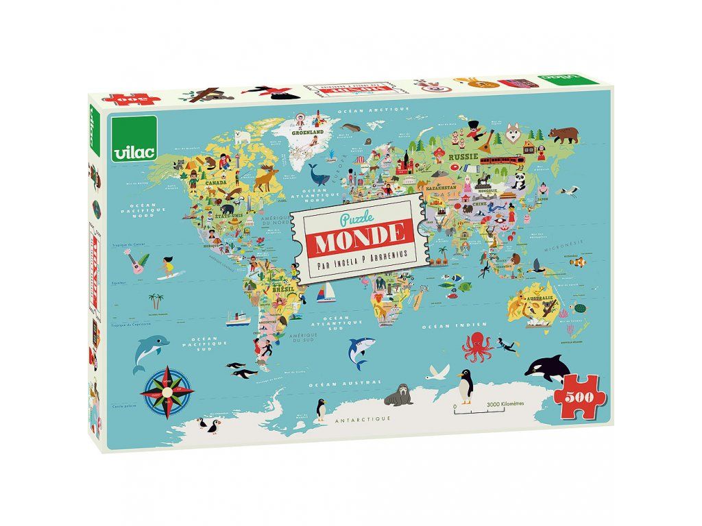 Krásně ilustrované puzzle mapy světa má 500 dílků. Po sestavení puzzle odhalíte mapu světa, která skrývá mnoho zajímavých deatilů. Děti se naučí jména zemí, hlavních měst, řek, moří i oceánů. Dále také něco z fauny, flory a tradic každé ze zemí.